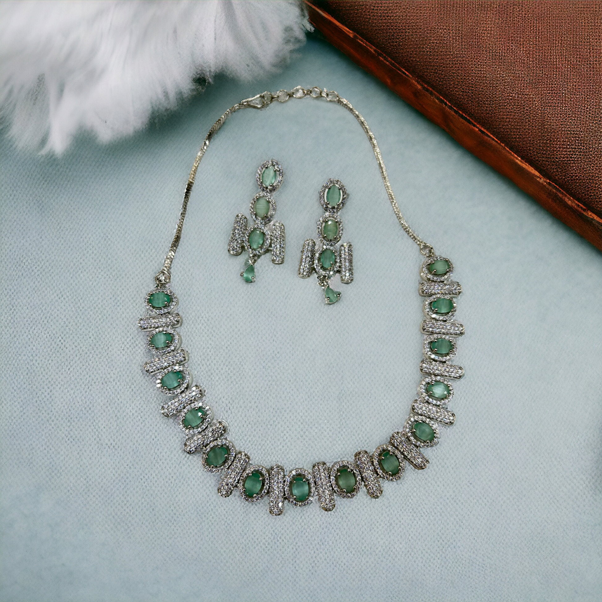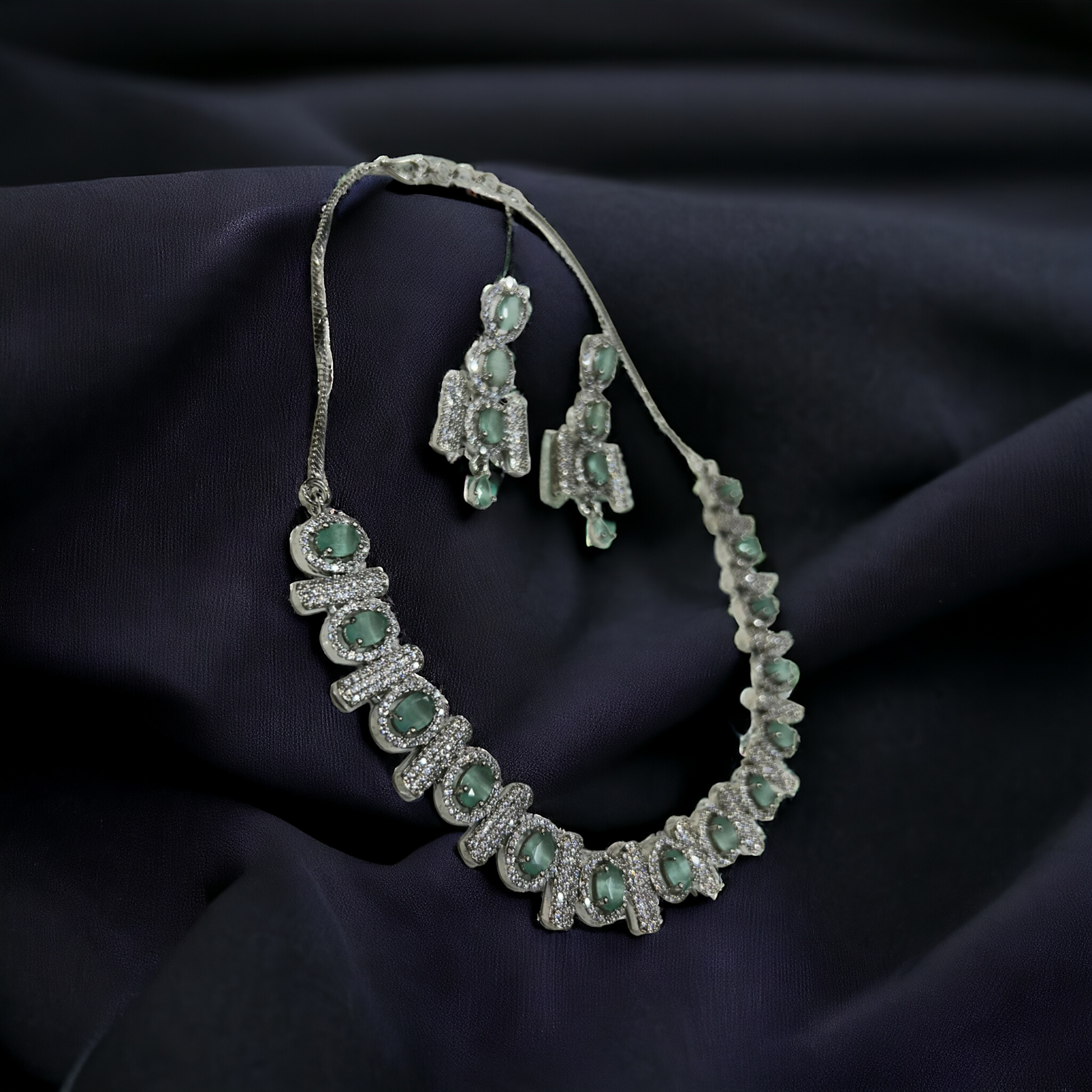 This elegant neckless set features stunning jade-colored earrings for a stylish and sophisticated look. The perfect addition to any outfit, these eye-catching accessories will add a touch of luxury and sophistication to your wardrobe. Elevate your style with this beautifully crafted neckless set.